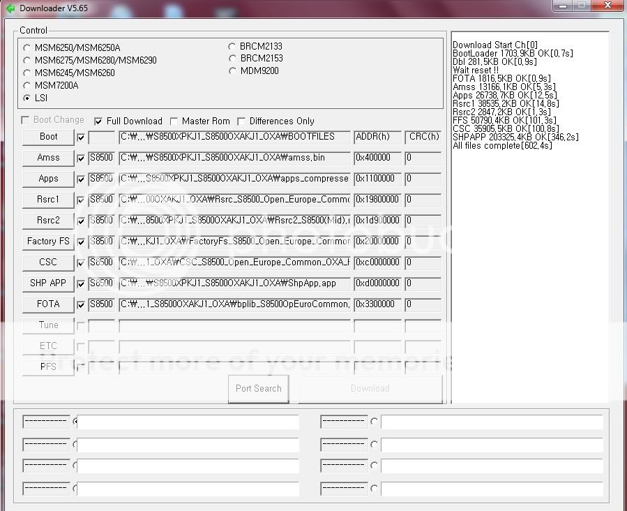 To be sure you get your connection or not see Kies ago - Open Samsung Kies after installed on your PC - Connect phone to PC by cable (If asked, choose the connection mode samsung Kies - by default from Manufacturer will not be asked unless you have changed) - Wait for the connection procedure is finalized - Disconnect your phone from the cable - the first FW extract directory, eg \ ... \ S8500 XPKJ1 III. Steps 1. Run the program Multiloader 5.65 a / Select the cell in the Control LSI b / Select the cell Full download c / Select the cell and lead to Boot file ... \ S8500 XPKJ1 \ BOOTFILES d / Select the cell ASSM -> \ S8500 XPKJ1 \ amss. bin e / Select the cell in Apps -> S8500 XPKJ1 \ apps_compressed.bin f / Select the cell Rsrc1 -> S8500 XPKJ1 \ Rsrc_S8500_Open_Europe_Common.rc1 g / Select the cell Rsrc2 -> S8500 XPKJ1 \ Rsrc2_S8500_Open_Euro_Common (Mid). rc 2 h / Select Car Factory FS -> S8500 XPKJ1 \ FactoryFs_S8500_Open_Europe_Common.f fs i / Select the cell CSC -> S8500 XPKJ1 \ CSC_S8500_Open_Europe_Common_SER.csc j / Select the cell SHP APP -> \ S8500 XPKJ1 \ ShpApp.app k / Select the cell FOTA -> \ S8500XPKJ1 \ bplib_S8500OpEuroCommon.fota ( Note: the FW any FOTA file to add up, does not have FW FOTA file then ignore all of you ) ... At the first FW extract directory, to be inspected see FW package unpacking the components to not miss. One of you for up missing FOTA file should finish up at the machine will error FOTA file is not installed there must be up to FW. 2. Performed on Wave - Shutdown - Press 3 key sources simultaneously - Turn down the volume - Lock (lock) and hold a few seconds. When the phone screen appear the words "Download Mode" red - Plug the cable into the phone - Kick Port search box. When you see the word Ready or Ready-Lismore, then OK. Usually your order received after 10 seconds - Kick to the box Download - machine takes about 25 minutes before I finished. When it reboots -> So complete is